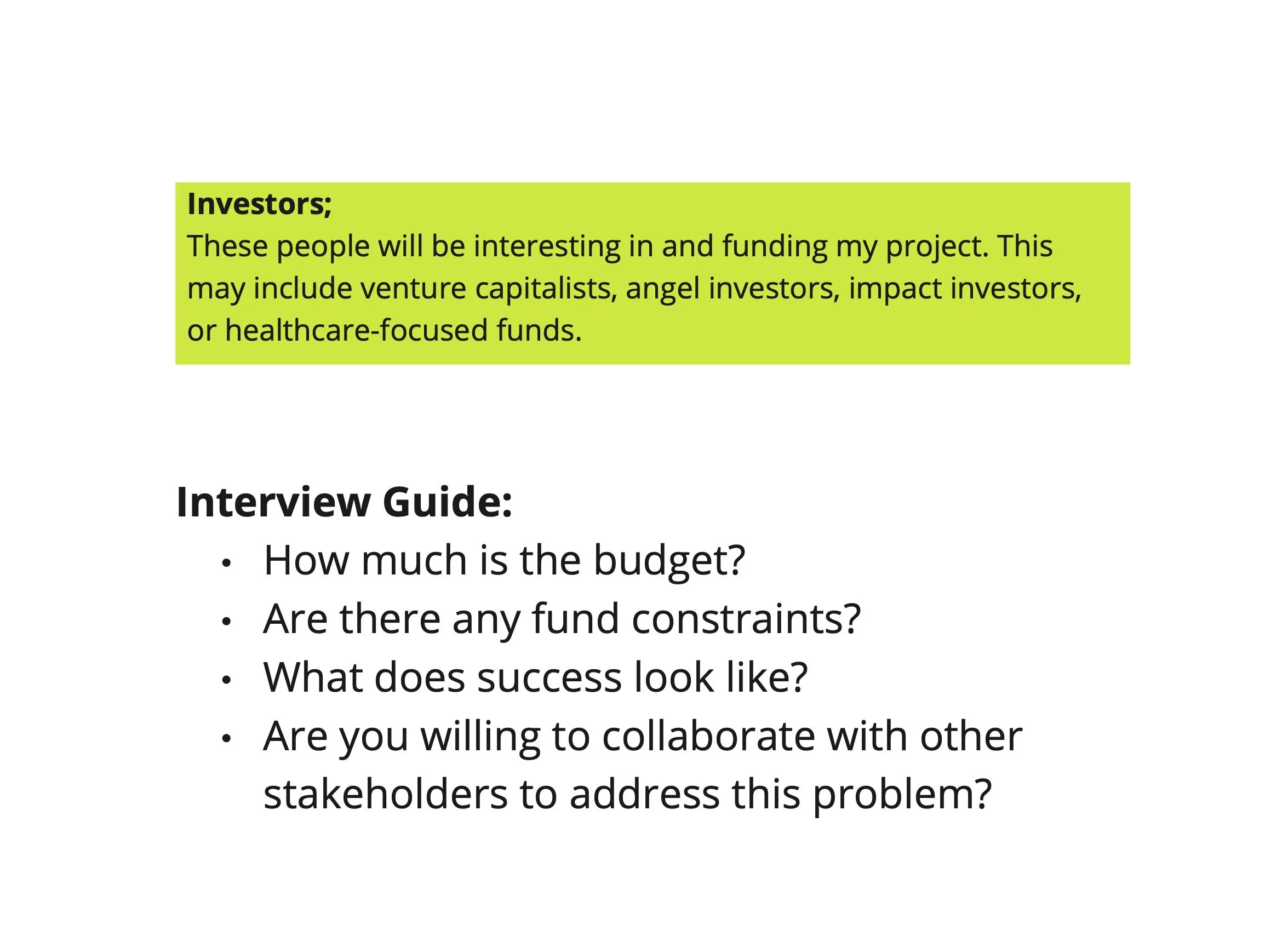 These stakeholders include professionals who can offer valuable insights through interviews, contributing both perspective and interest in the project’s success. Their feedback will help establish success metrics and shape the design process, informed by the specific questions and discussions raised during the stakeholder interviews.